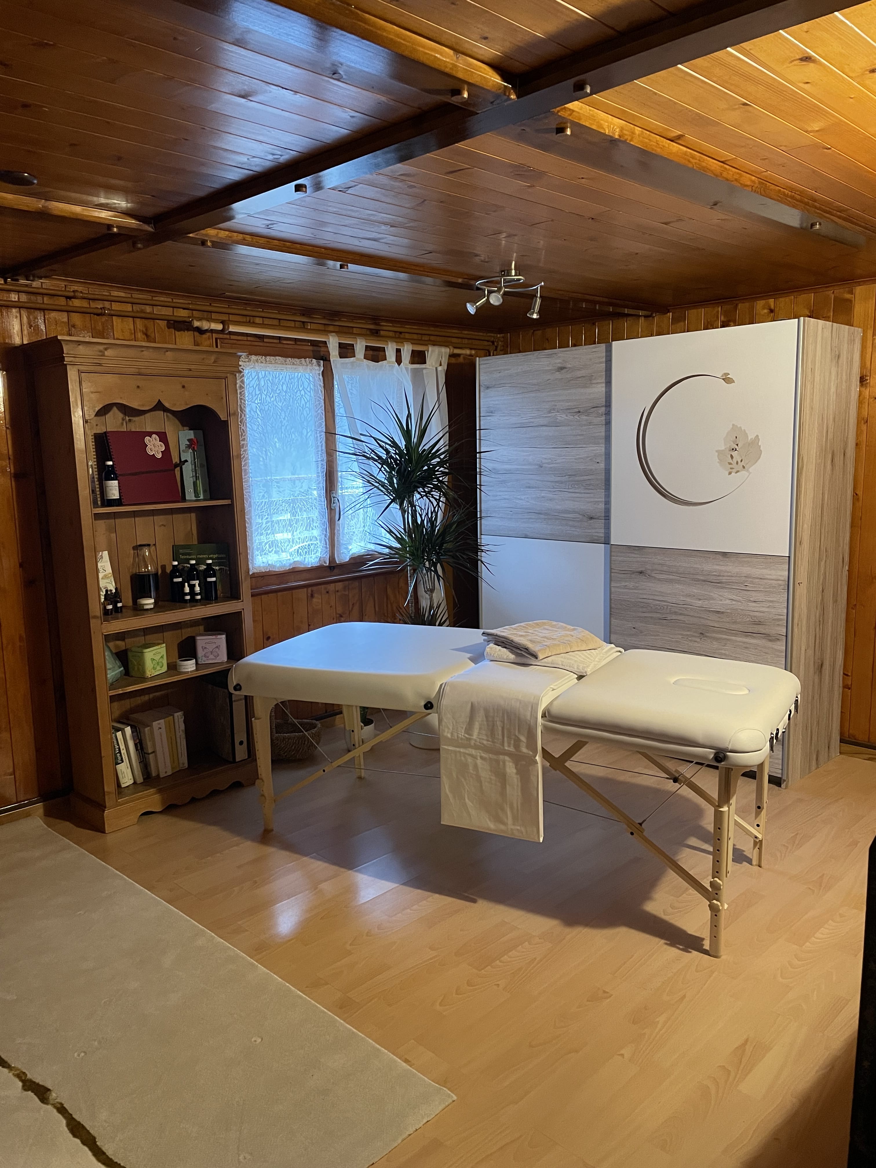 Je vous accueille dans mon cabinet au rez-de-chaussée d'un chalet de montagne, un lieu unique et chaleureux à mon image. Je me déplace également à domicile.